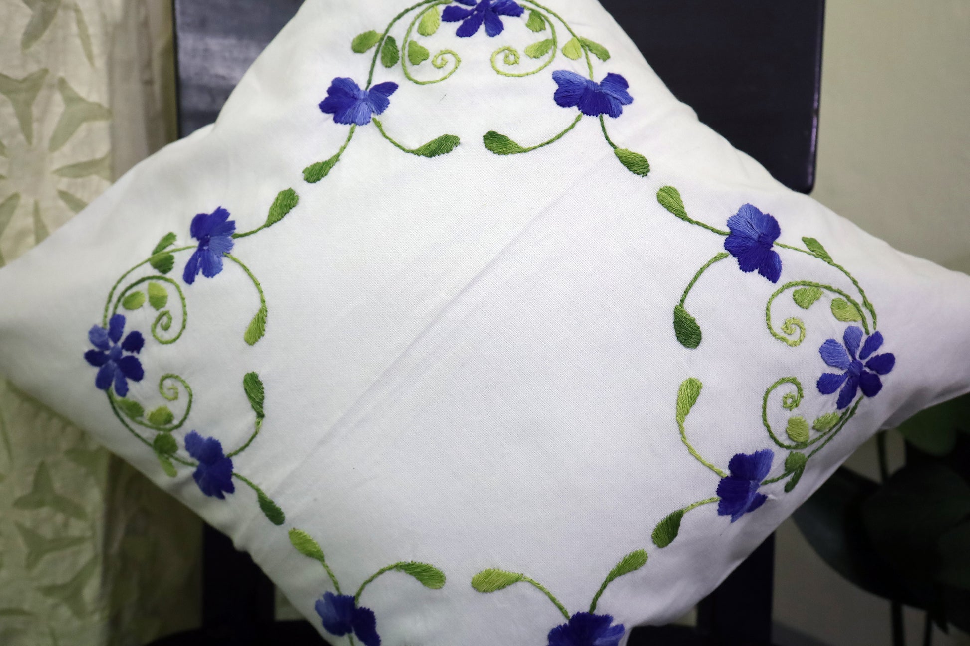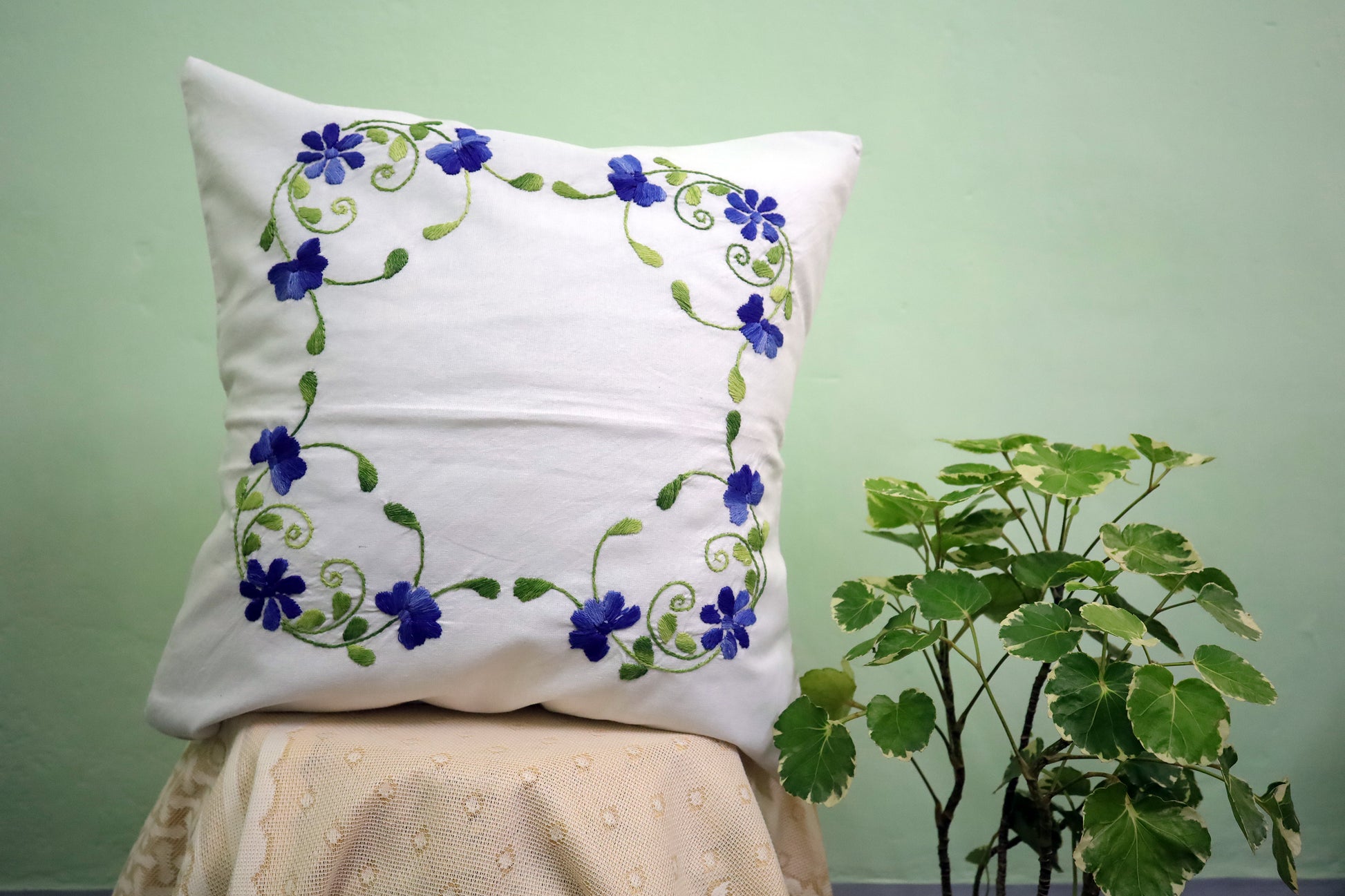 - One Hand Embroidery Floral Cotton Cushion Cover